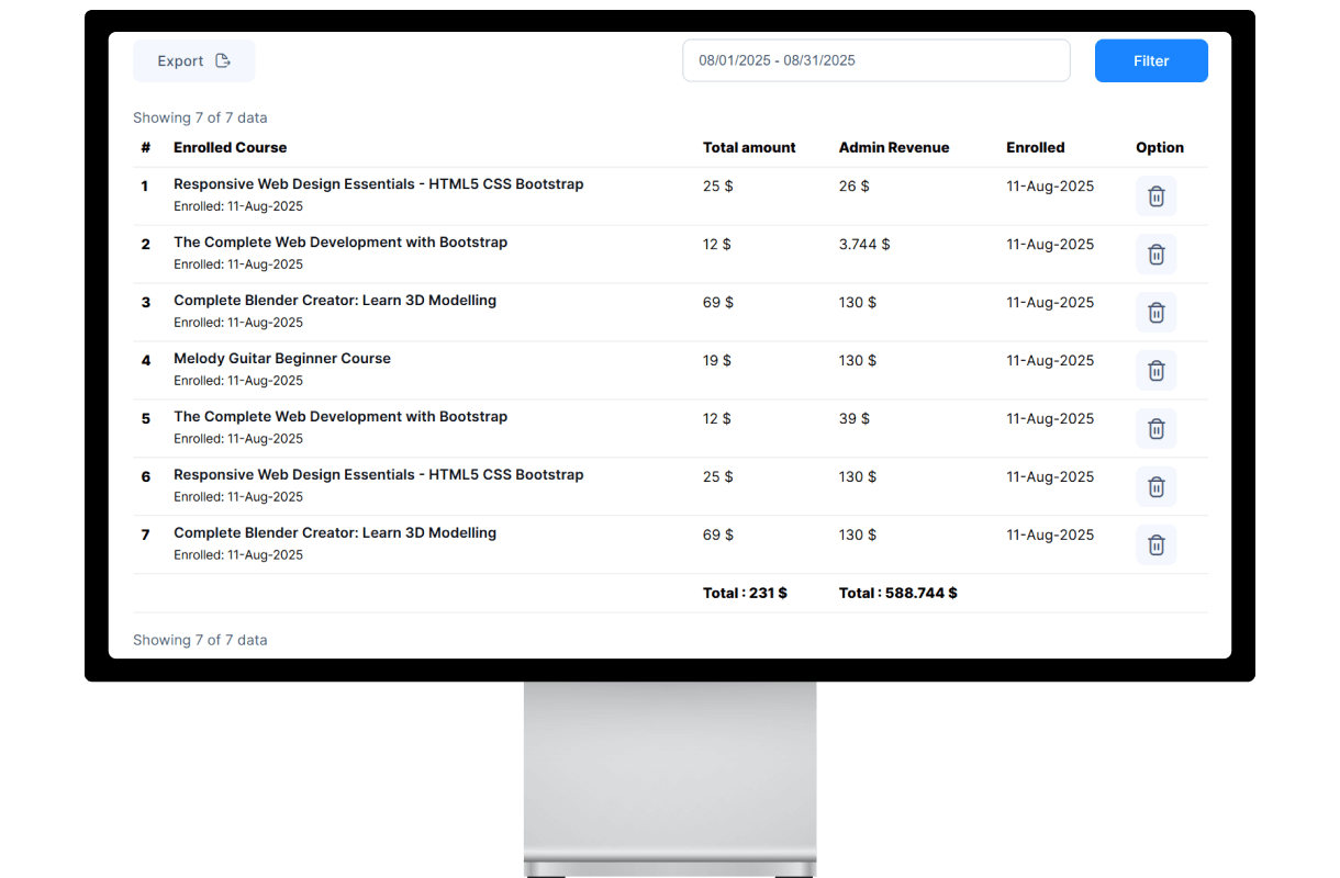 Easily track and analyze your earnings with the built-in Admin Revenue Report in Academy LMS Laravel.