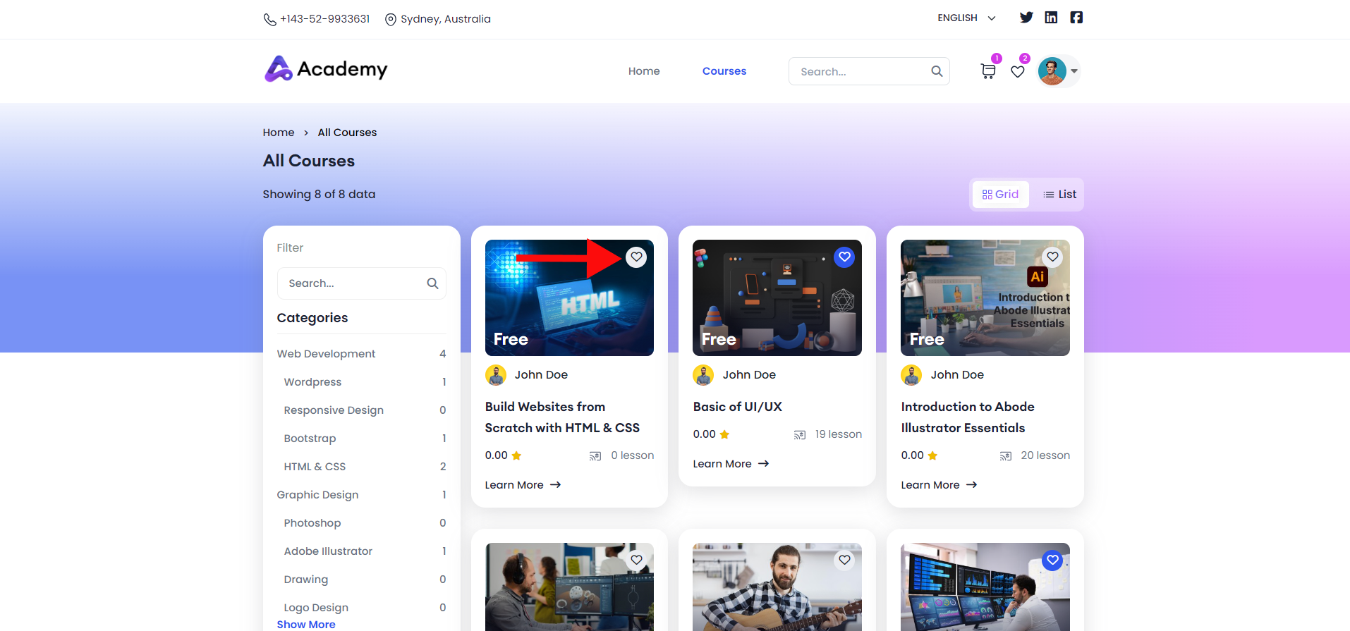 You can go to the Courses page, and click on the Heart button on top of any course that you’d like, to add it to the wishlist. You can also click on the course, and view the details, and then add to your wishlist by clicking on the Add Wishlist button.