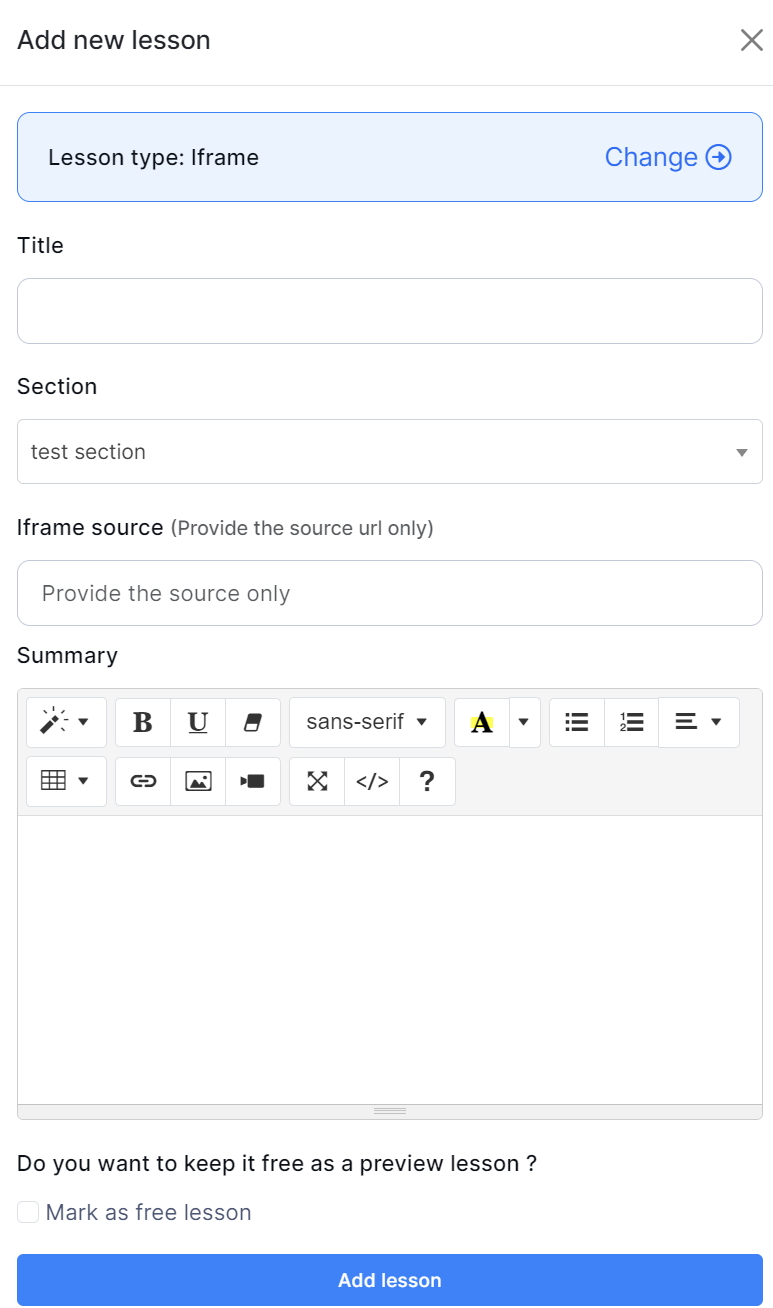 Select the "Add lesson" button to add a new Text lesson.