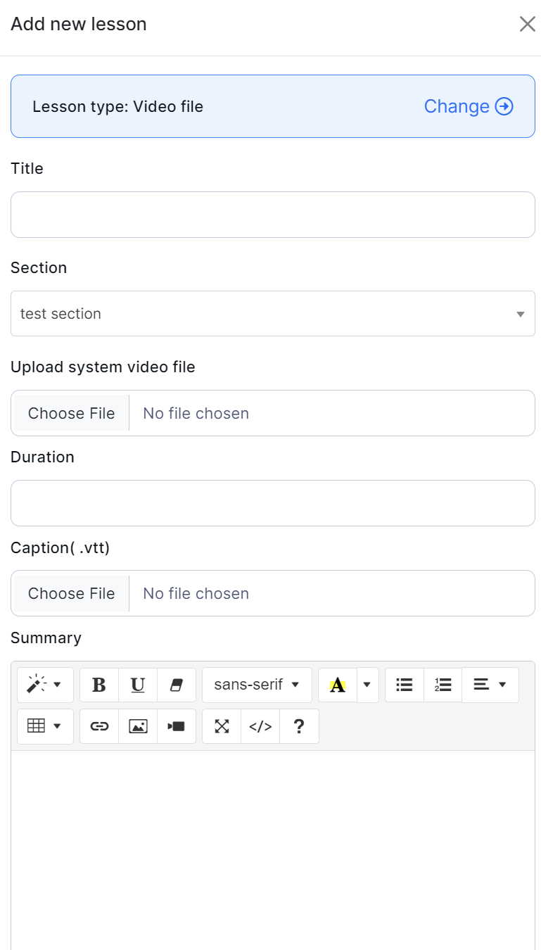 Select the "Add lesson" button to add a newVideo file lesson.