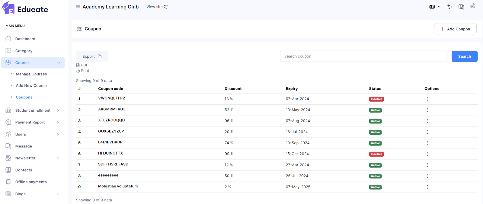 Make course coupons with which students can avail certain discounts in available courses. Follow the steps below to create course coupons as an admin: