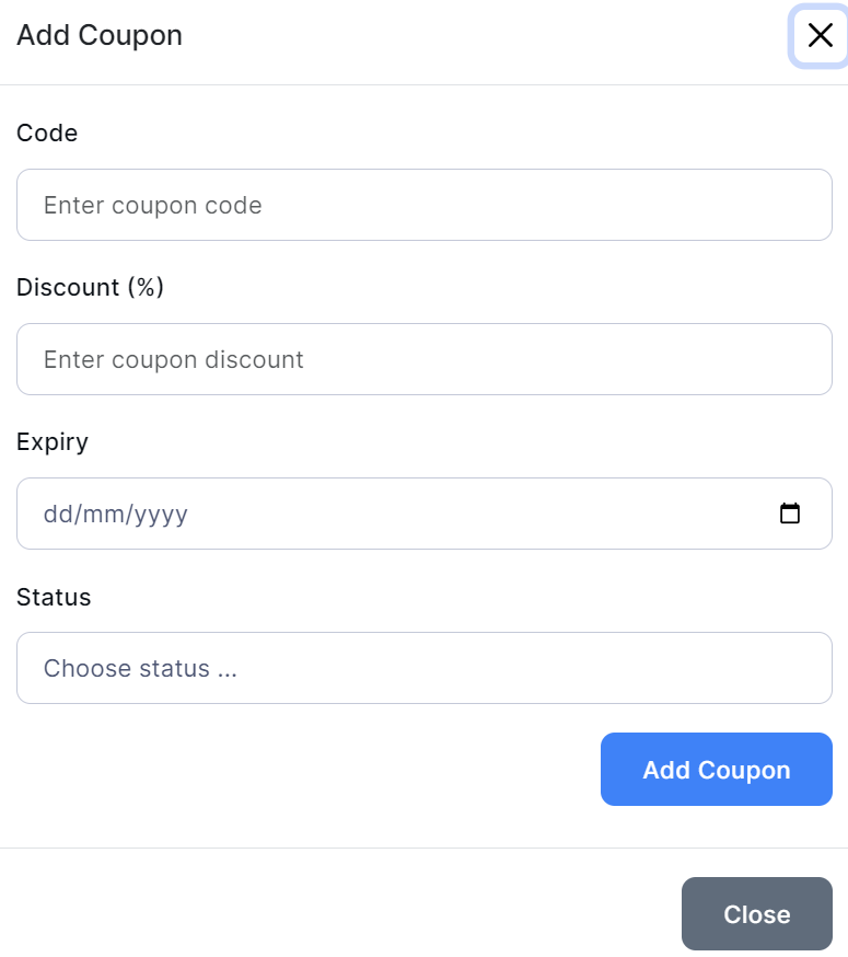 Click on the + Add Coupon button. The following window will pop up:
