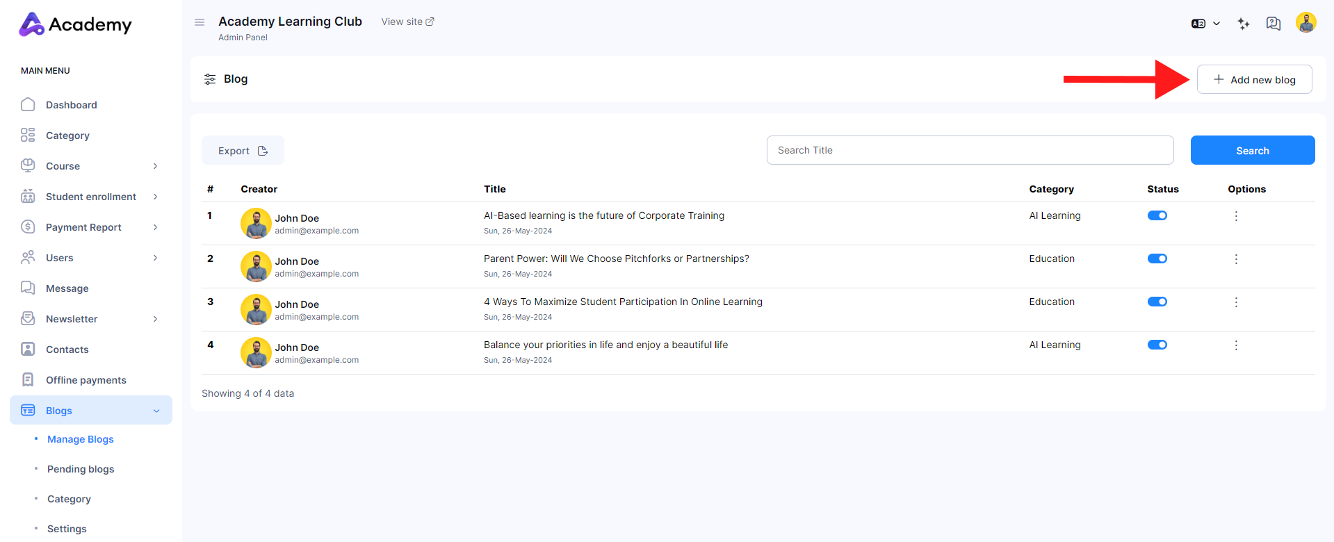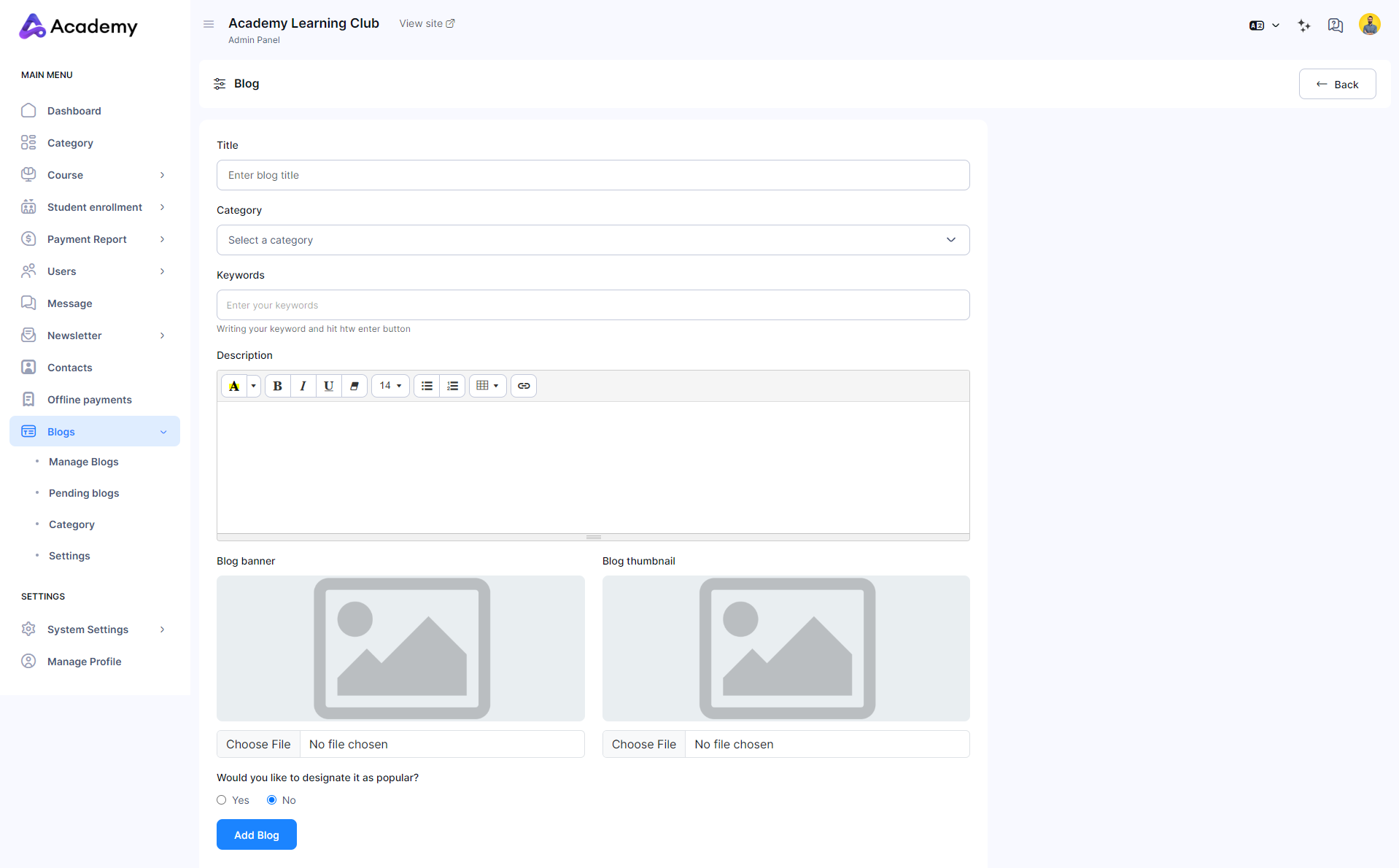 Publishing a blog on the application site is an easy task for the site admin. With just a few clicks, you can easily share your content with your audience. Additionally, managing existing blogs is simple, giving you full control over your content. Follow the steps below for site admins to publish blogs on the website easily.