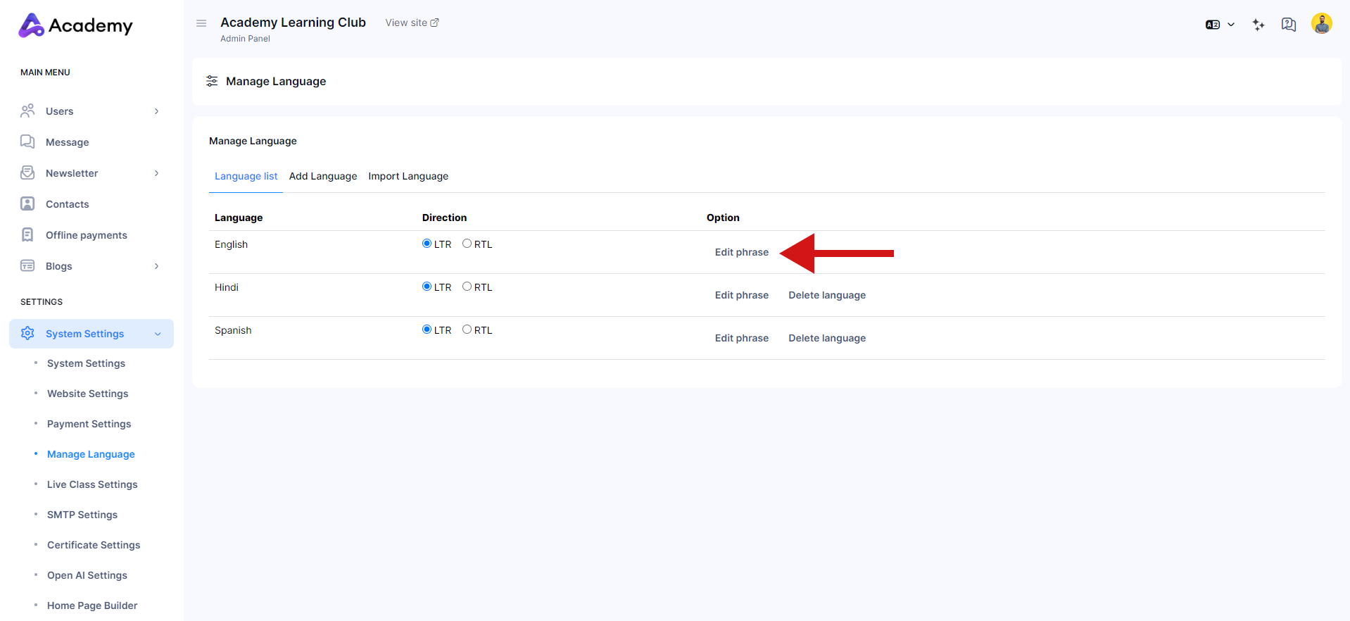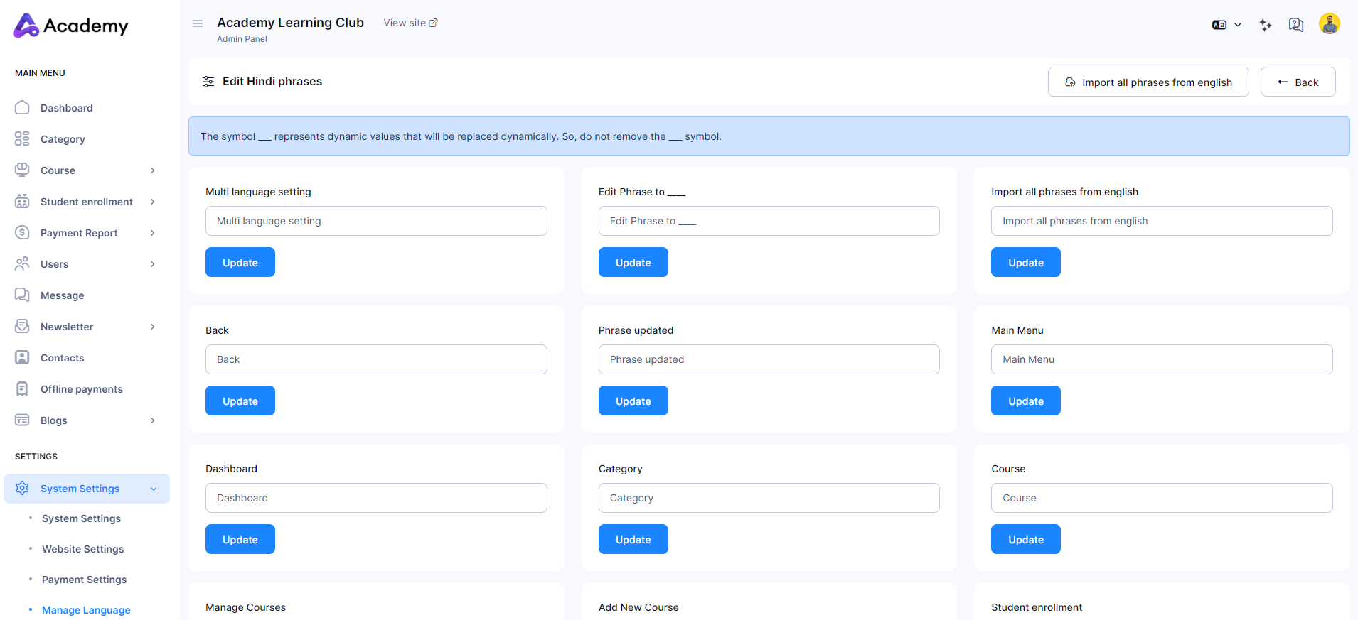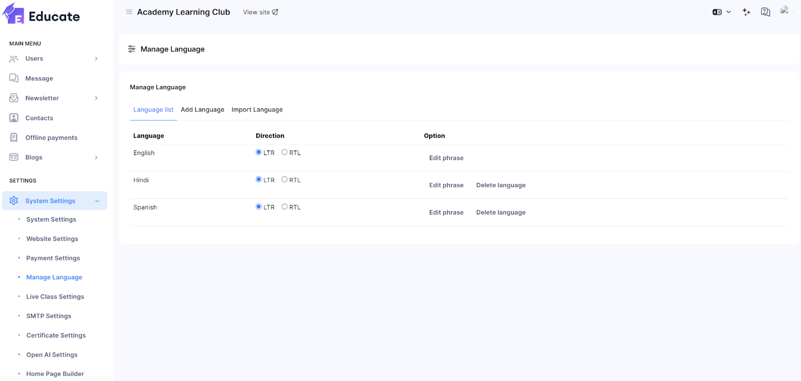 Academy LMS Laravel offers extensive language support, allowing you to change the system language of the application whenever needed. You have the flexibility to add new languages and customize phrases within the application. Additionally, you can import or export languages as JSON files directly from the application, making language management seamless and efficient.