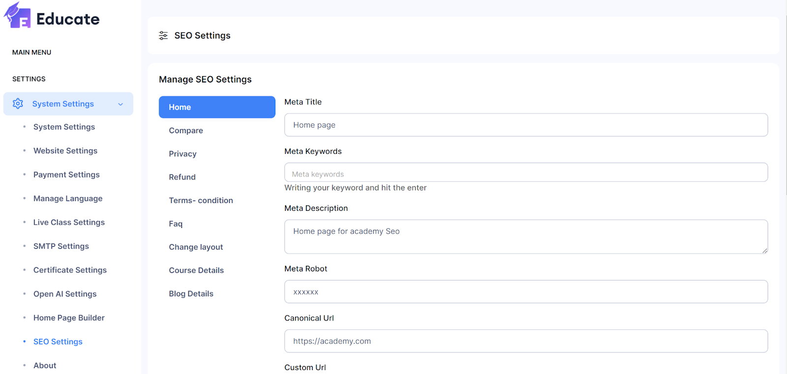 1. You can click on any page (Home, Compare, Privacy, Refund, Terms-condition, FAQ, Change Layout, Course Details, Blog Details) that you would like and set up the SEO settings.