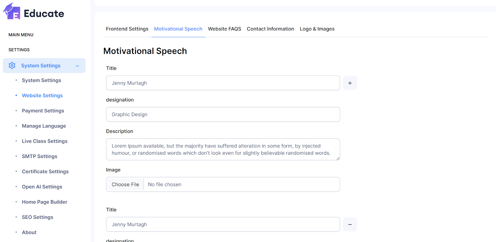 Within the website settings panel, you can configure all aspects relevant to your website. This includes settings such as frontend settings, homepage layout, motivational speeches, website FAQs, contact information, and logo images. It is a centralized hub for managing and customizing various elements of your website to align with your preferences and requirements.