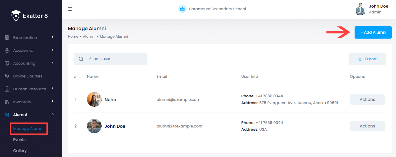 Admin has the authority to add an alumni, the below steps might be helpful for adding a new alumni: