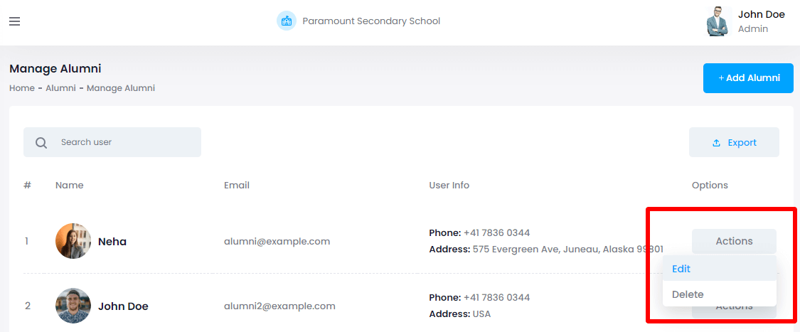 Admin has the authority to edit an alumni's information. For this, you can follow the below steps: