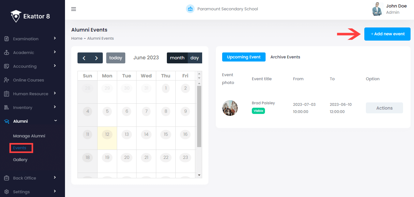Admin can create an event anytime from the Alumni event option. For this, you can follow the steps below:
