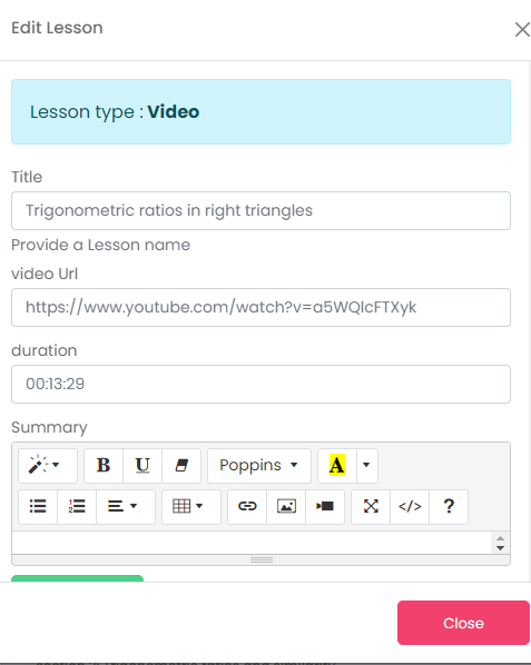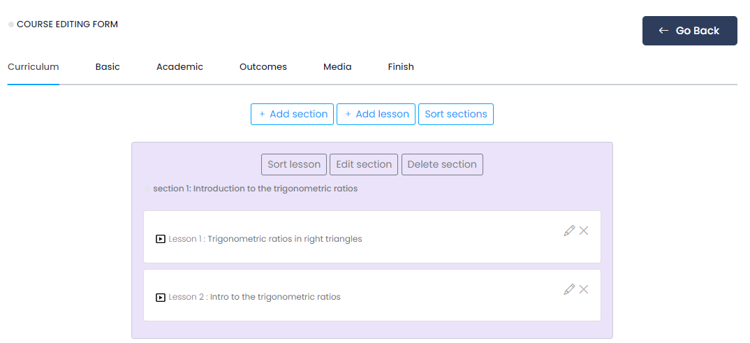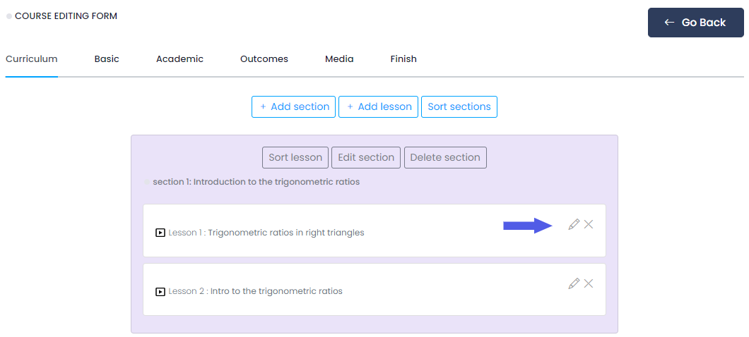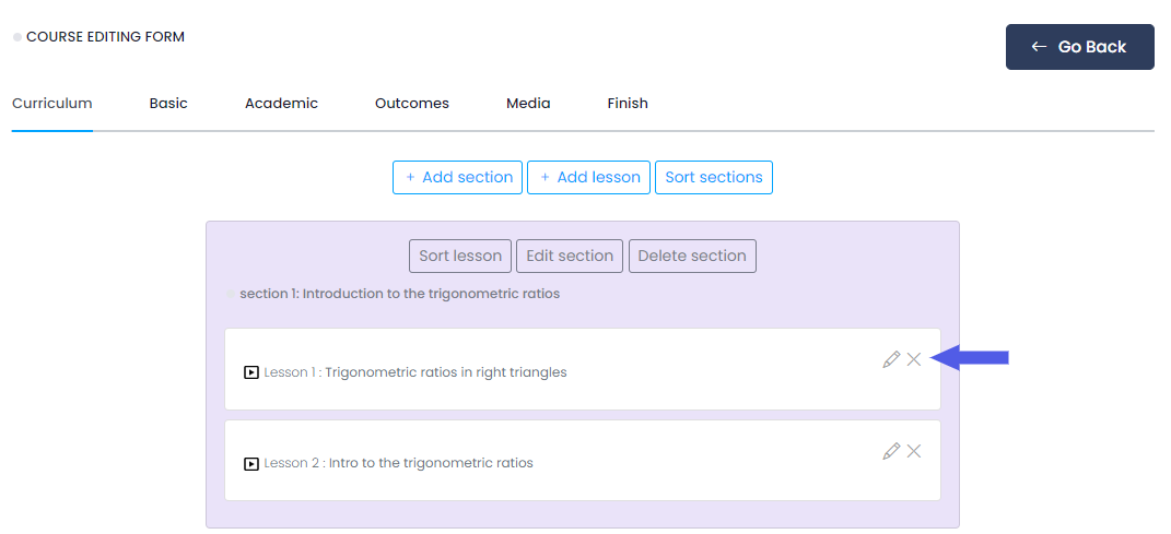 For deleting a lesson you need to click on the "X" button from the lesson section.