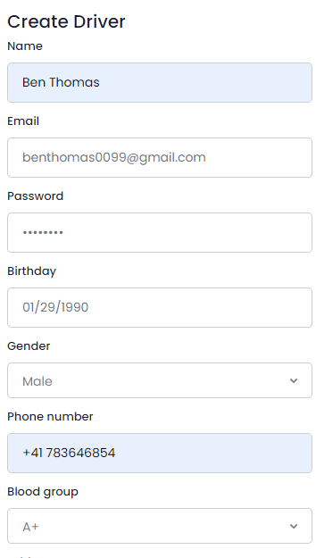 After filling in these sections click on the "Create" button for creating a vehicle.
