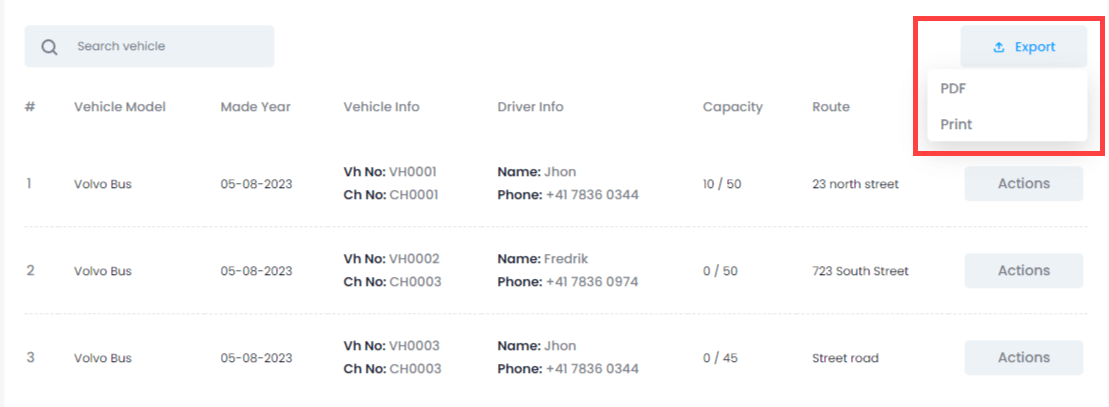 You can make a PDF file or Print the list of the vehicle by clicking on the button called "Export" from the right side.
