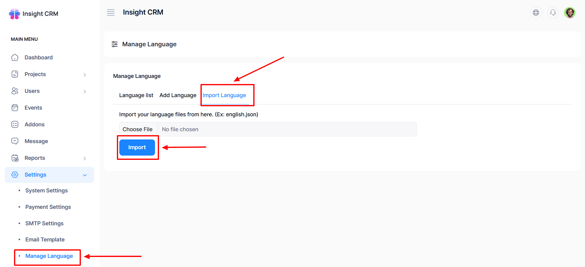 - Click the Drag & Drop or Browse button to upload the language file (Ex:, English.json).