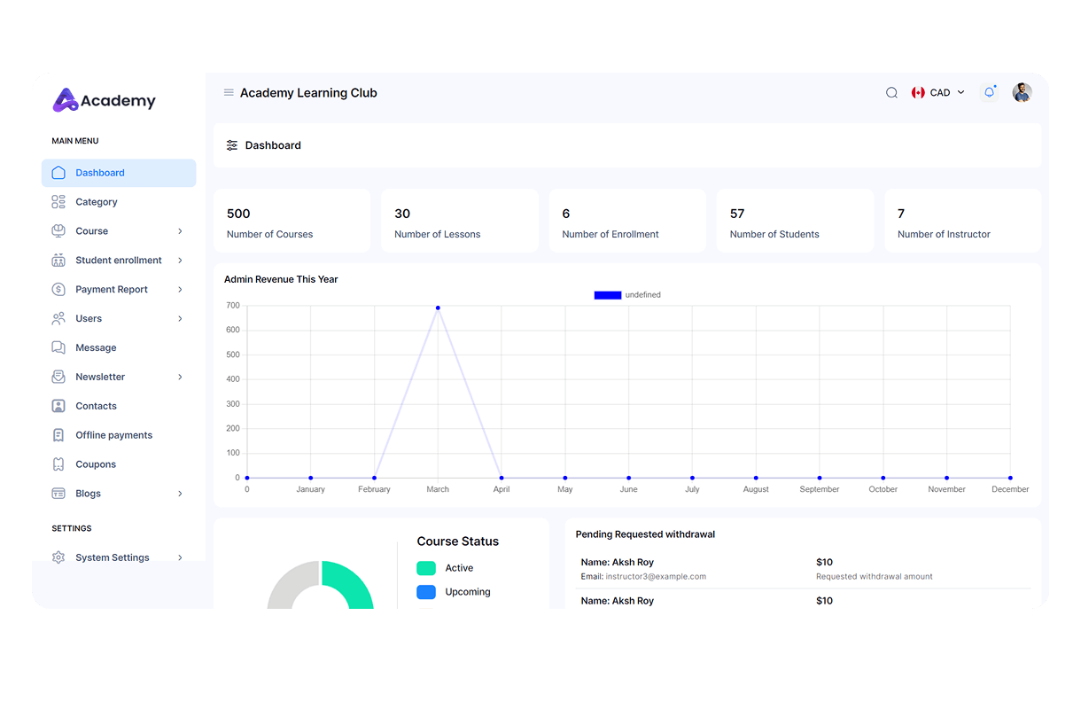 Easily track and analyze your earnings with the built-in Admin Revenue Report in Academy LMS Laravel.