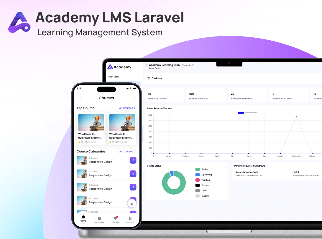 Academy LMS Laravel is an online course-based learning management system. This web application is designed for creating courses, selling courses to students, and managing web portals. Academy LMS Laravel is introduced with cutting-edge and updated features with the Laravel (PHP Framework) version. Site administrators and course teachers can easily design, sell, and manage courses with this online course-based learning management system. With so many courses available that are customized to meet their needs, students can effortlessly expand their knowledge. This application allows teachers to easily include documents, photographs, videos, and text in their lessons, providing students with a better learning environment.