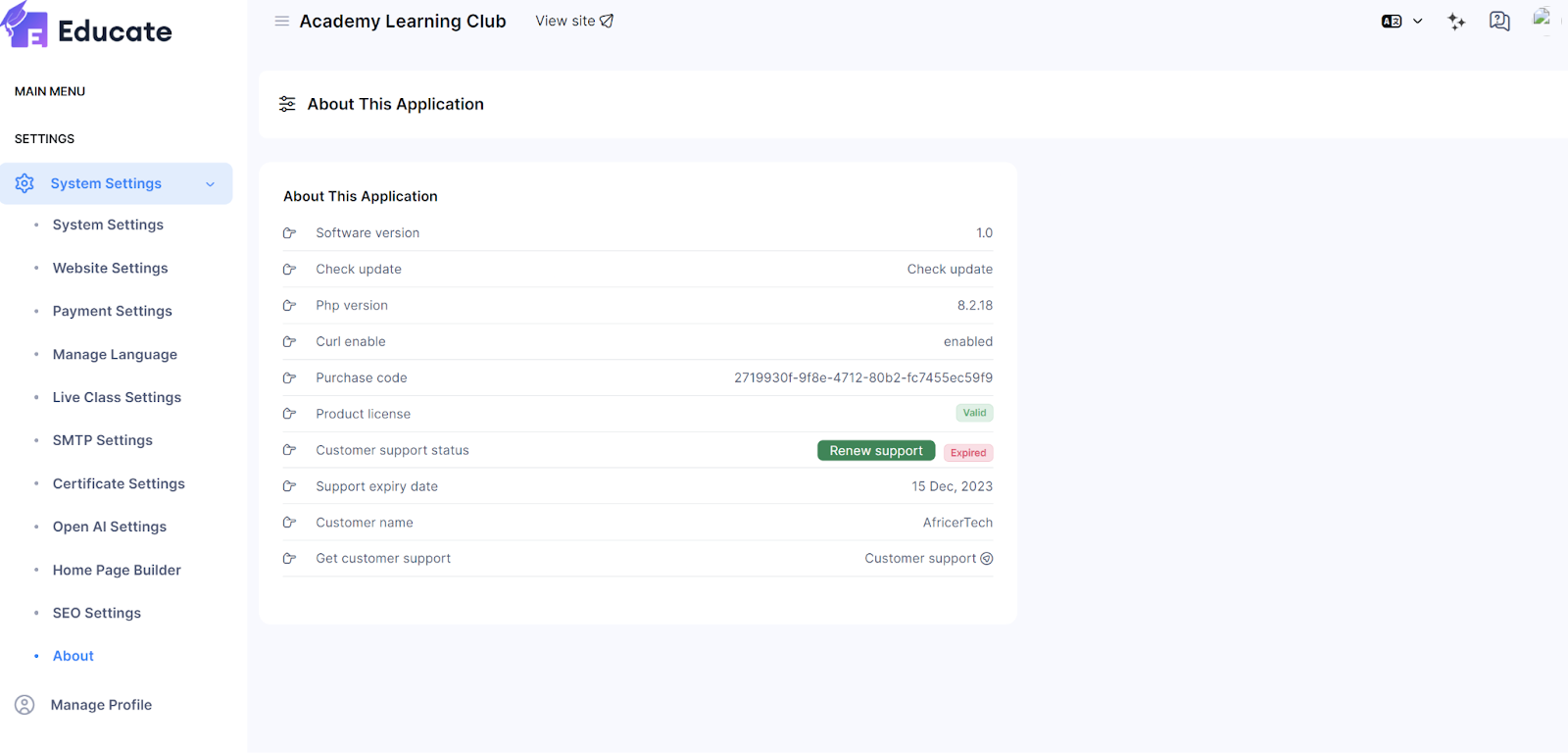 You can enable the customer support by clicking on the Customer Support button, which will redirect you to the support page for submitting a ticket.