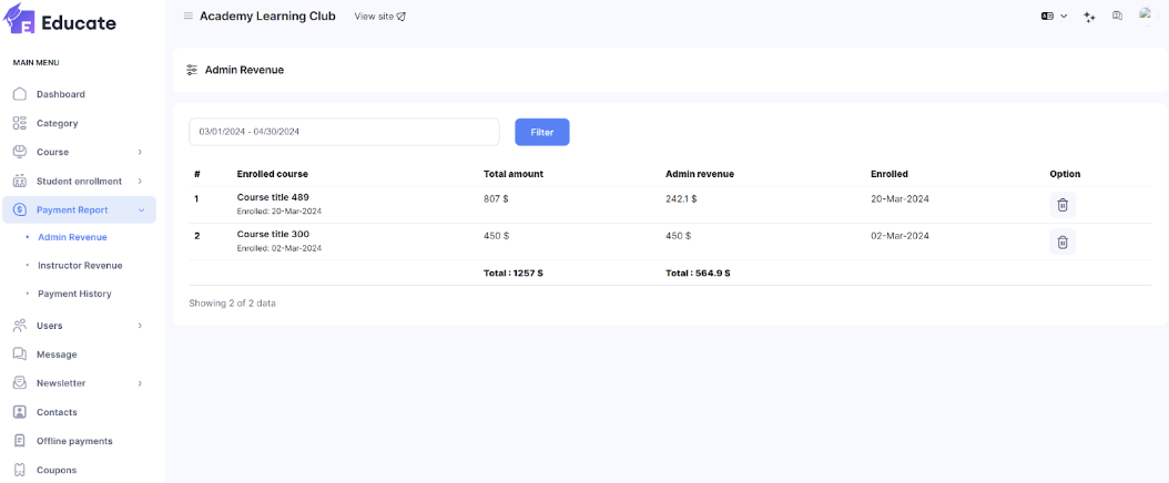 You can Filter courses based on their enrolled date, and view the calculated totals for both total earnings from courses and total revenues earned as an instructor from the courses.