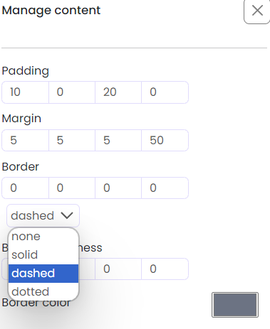 The value fields are in the following order: Top, Right, Bottom, Left. You can enter the values of Padding, Margin, Border, Border roundness of the section manually. You can also choose the Type of Border (Solid, Dashed, Dotted).