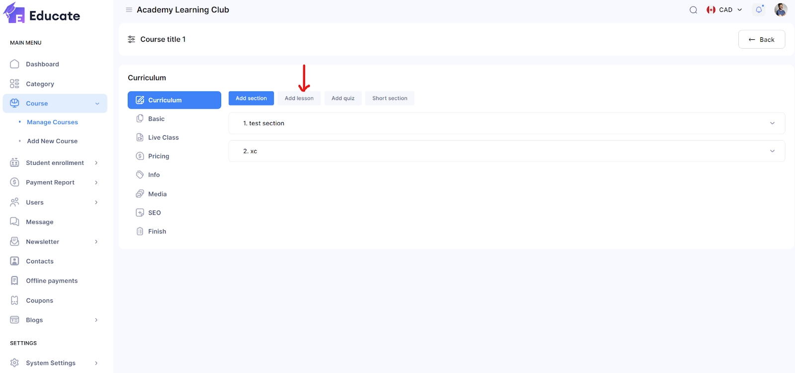After clicking on the course, click on the Add Lessons button located on top.