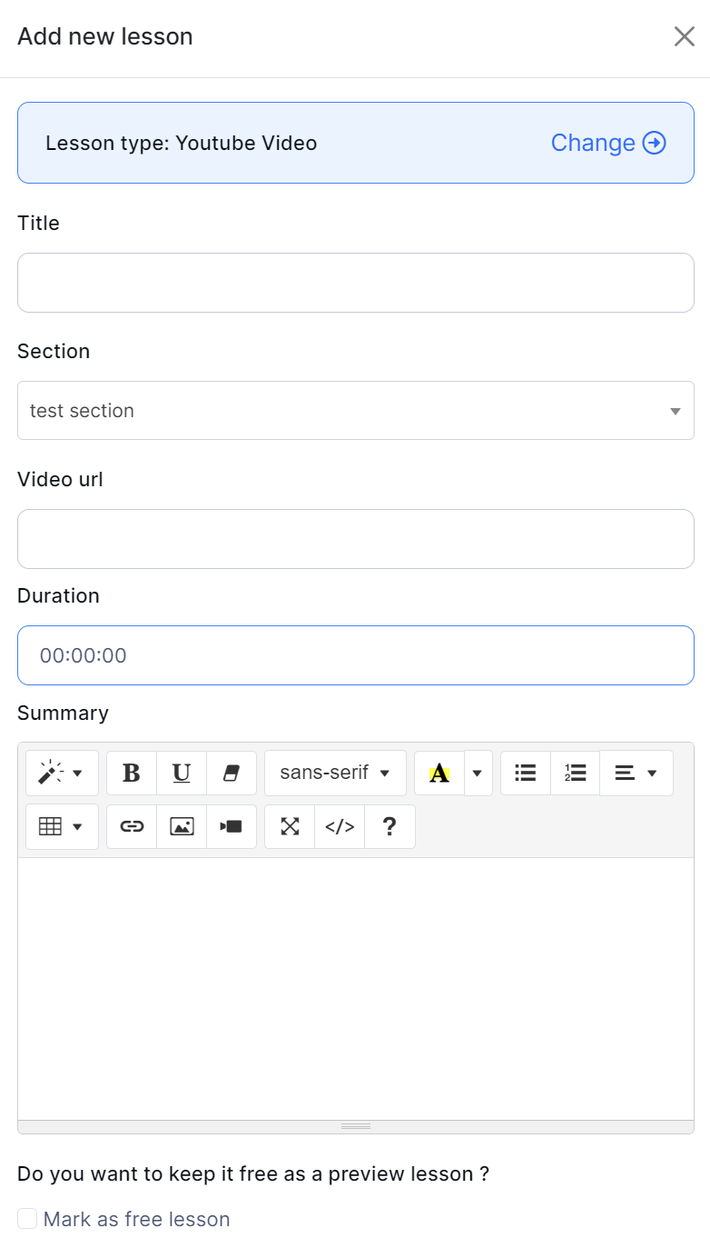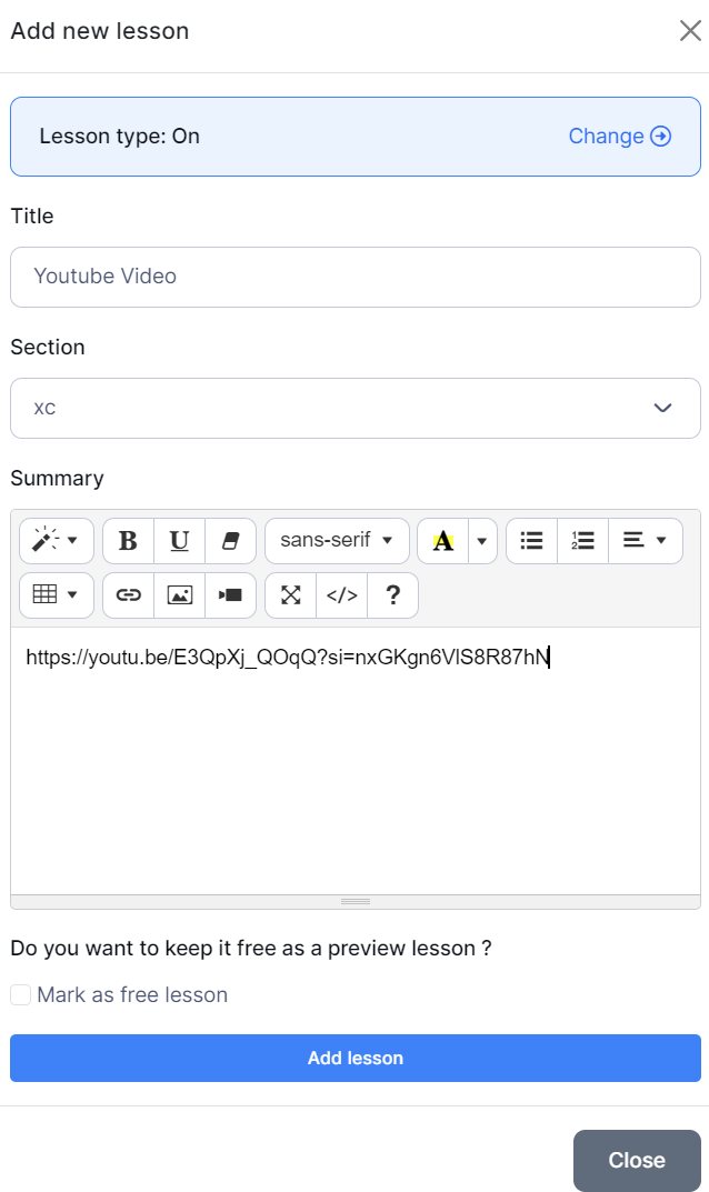 Select the "Add lesson" button to add a new Youtube video lesson.