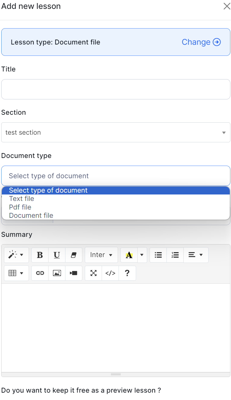 Select the "Add lesson" button to add a new Document File lesson.