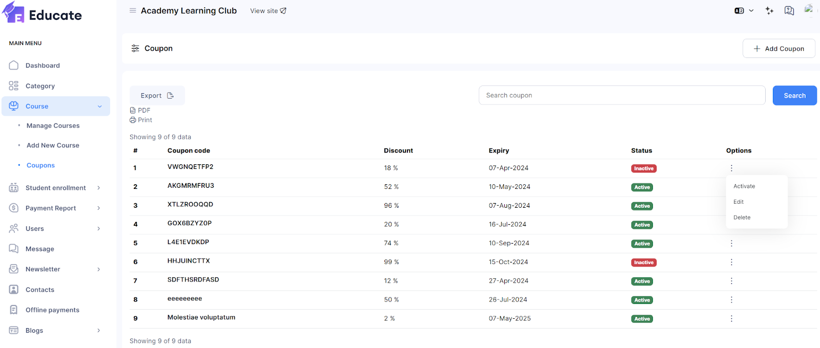 Make course coupons with which students can avail certain discounts in available courses. Follow the steps below to create course coupons as an admin: