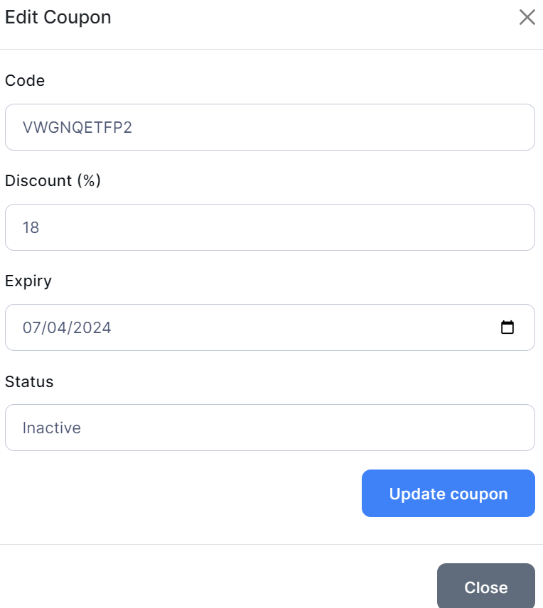 If you want to Edit the coupon, click on Edit, and the following window will pop up: