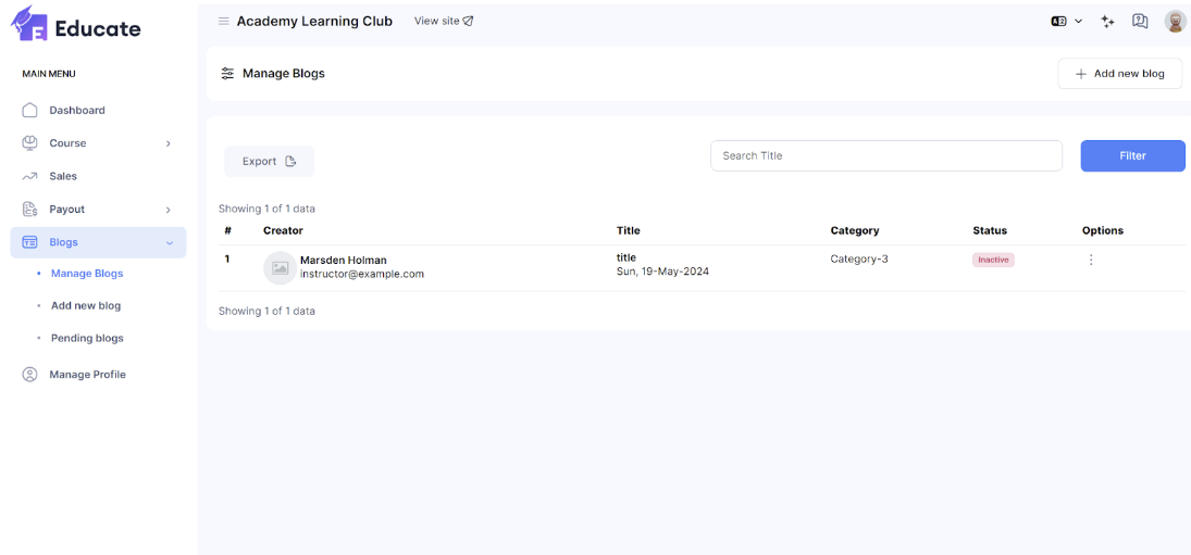 Instructors can view the pending blogs that are waiting to be approved by admin inside the Pending Blogs page.