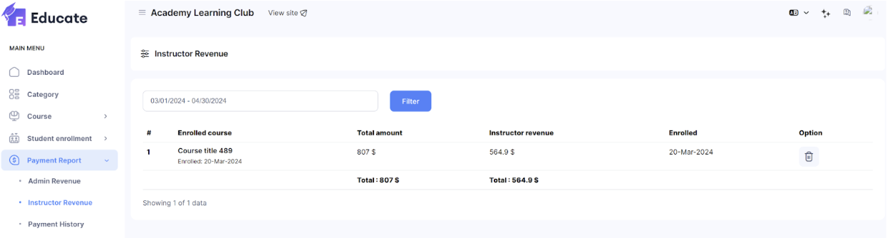 You can Filter courses based on their enrolled date, and view the calculated totals for both total earnings from courses and total revenues earned as an admin from the courses.
