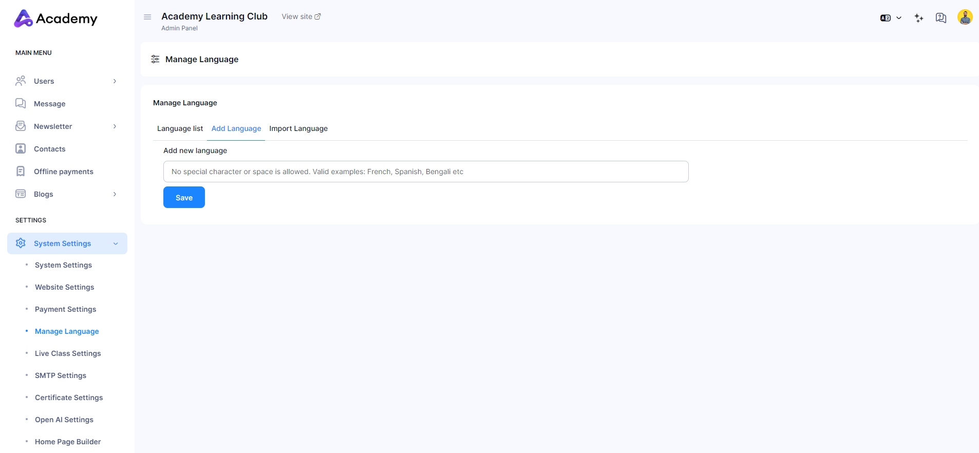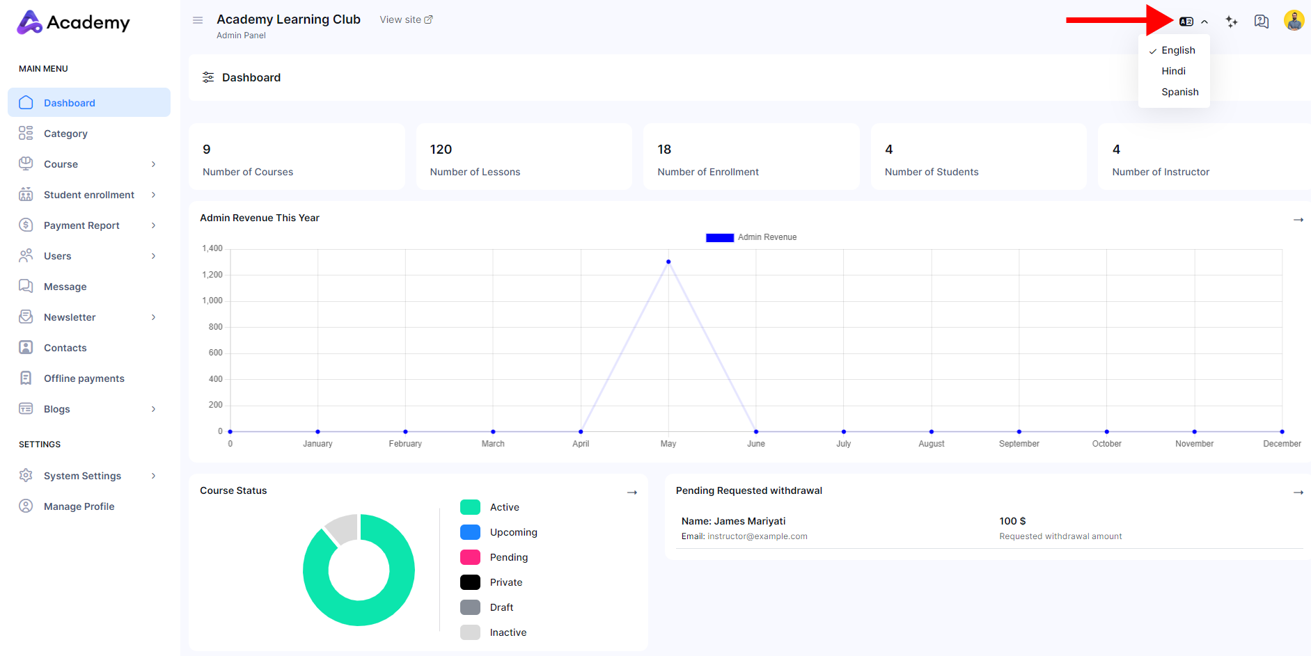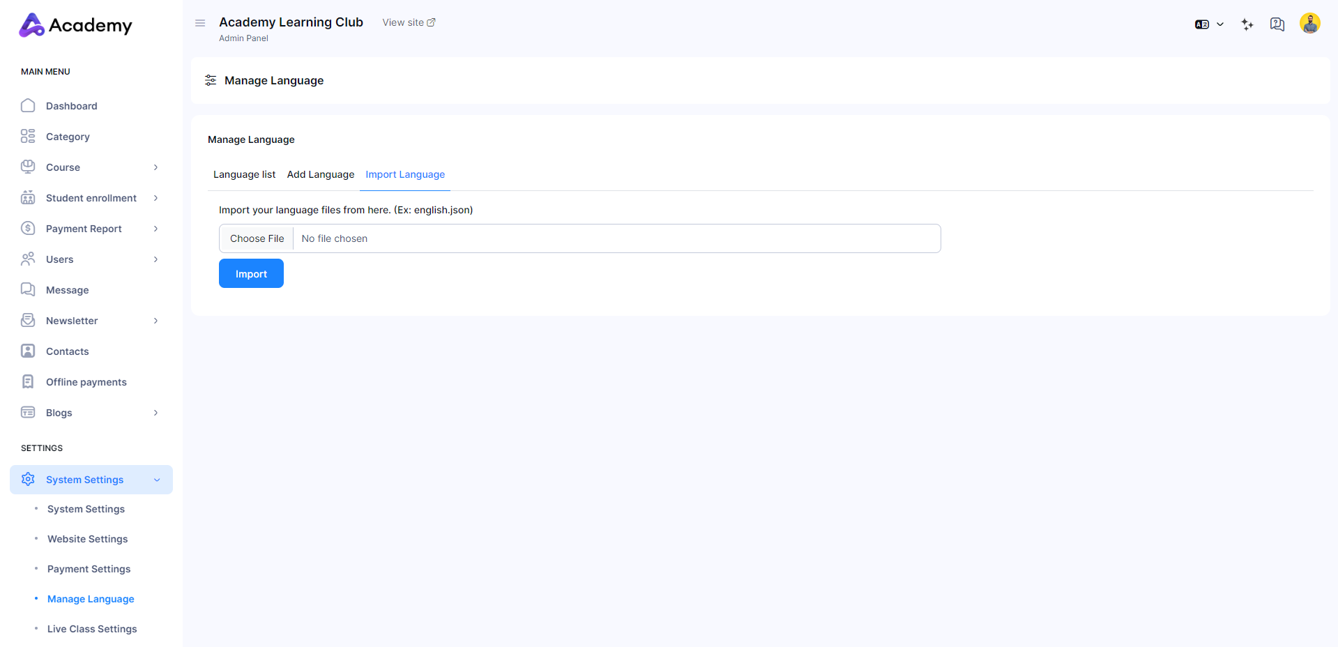 Academy LMS Laravel offers extensive language support, allowing you to change the system language of the application whenever needed. You have the flexibility to add new languages and customize phrases within the application. Additionally, you can import or export languages as JSON files directly from the application, making language management seamless and efficient.