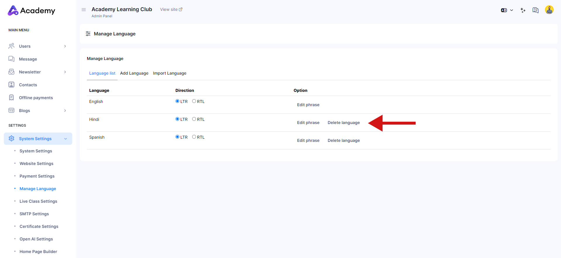 4. Then, beside the language you want to delete, click on the Delete Language button.