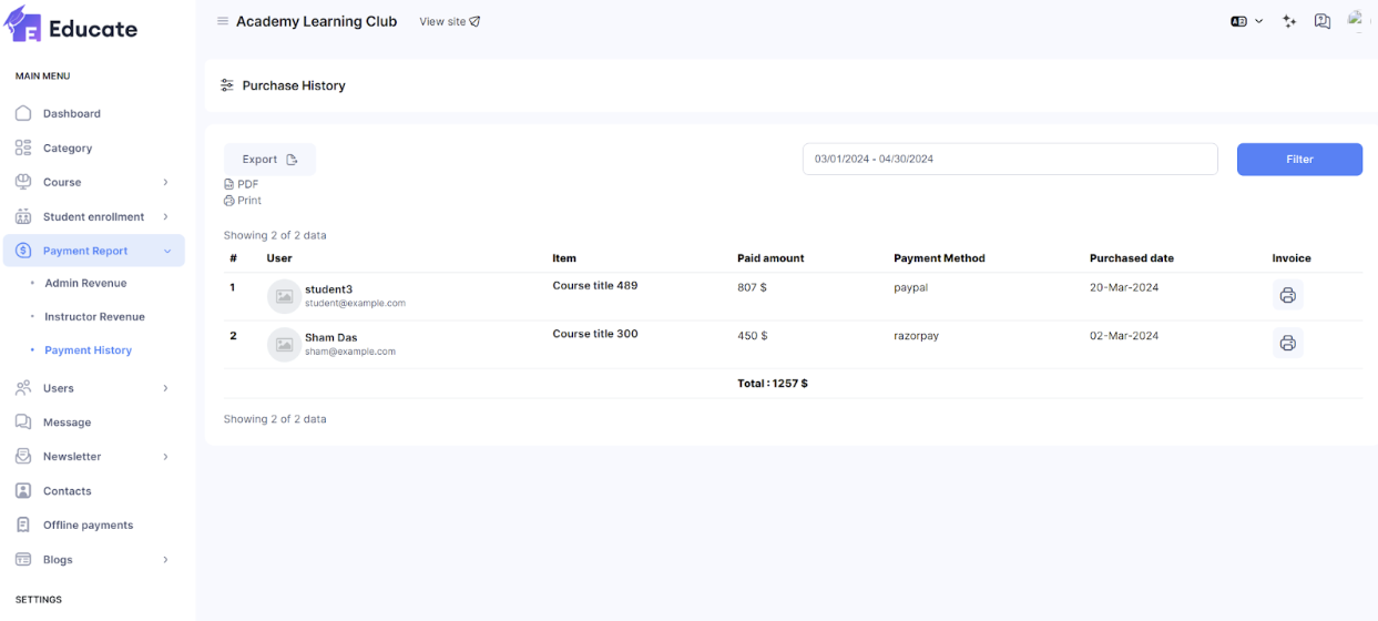 You can view the payment history listed with the student names, the courses they’re enrolled in, paid amount, payment method and purchased date.