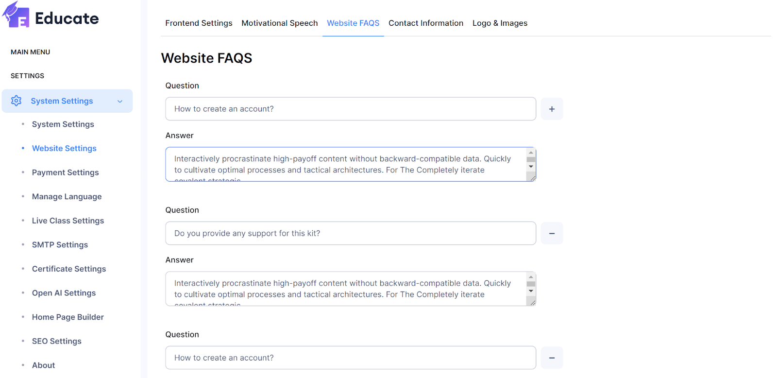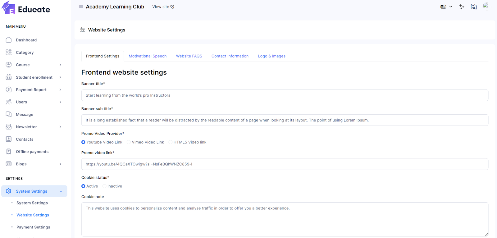 Within the website settings panel, you can configure all aspects relevant to your website. This includes settings such as frontend settings, homepage layout, motivational speeches, website FAQs, contact information, and logo images. It is a centralized hub for managing and customizing various elements of your website to align with your preferences and requirements.