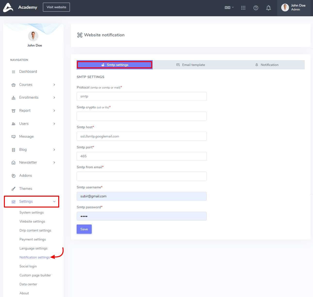 In this settings panel, you can configure your SMTP settings, edit your email templates, and manage system notifications.