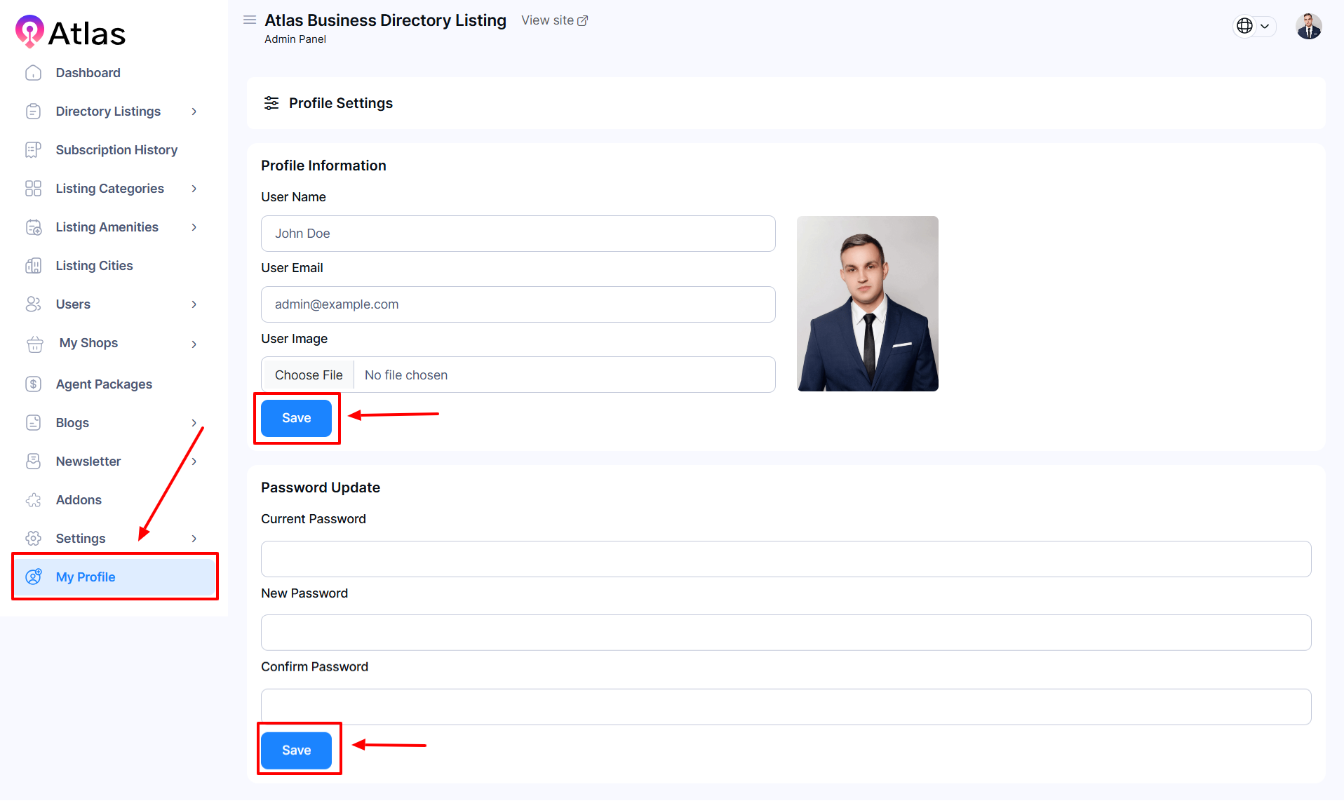 In Atlas Laravel, Manage Profile allows businesses to update and personalize their account information. Admins and users can edit details like names, contact information, and social links. Keeping profiles updated improves credibility, strengthens professional connections, and enhances customer trust, supporting better engagement and a more dynamic business presence.