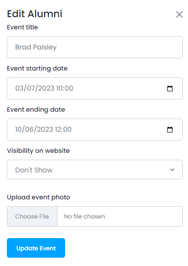 The administrator has access to create alumni. Alumni can edit and update their information after receiving login details from the admin. The following actions could be useful for that:
