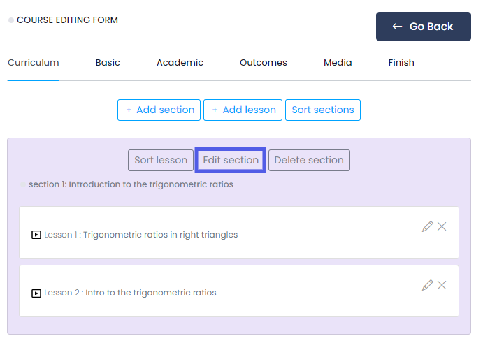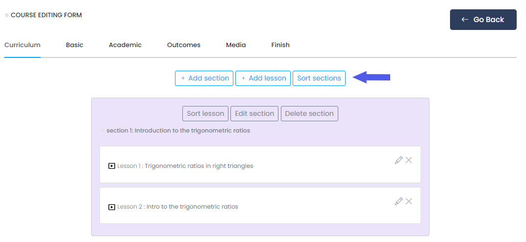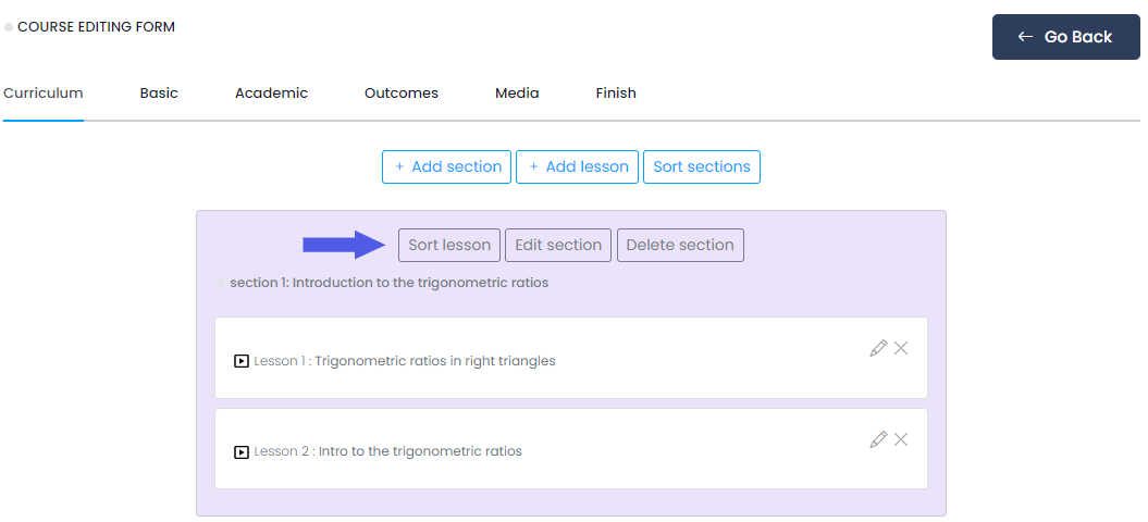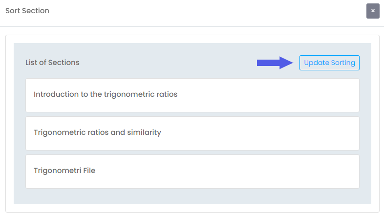 For organizing your lesson according to the syllabus, you can sort sections regarding your choice. For sorting section, you can follow the steps below;