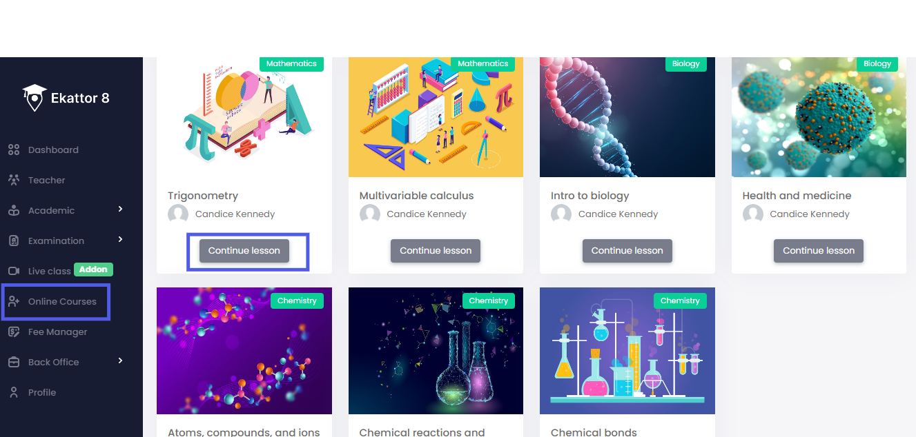 Ekattor 8 Online Course Addon is an educational model where you can organize your lesson according to your syllabus. This Online Course Addon will help to connect with students virtually. Teachers can prepare their courses from home & share them with their students online. Students can take these courses and complete their syllabus at home without attending the class physically. This is all possible only with the help of a Smartphone, Laptop, and Internet Connection.