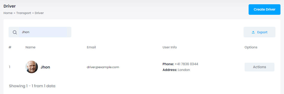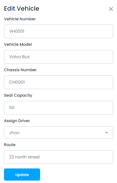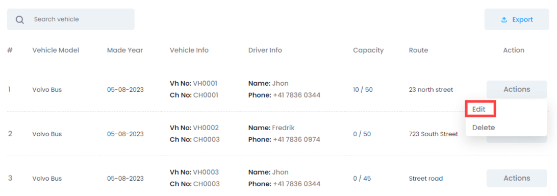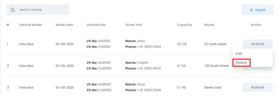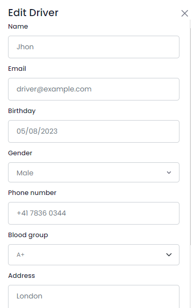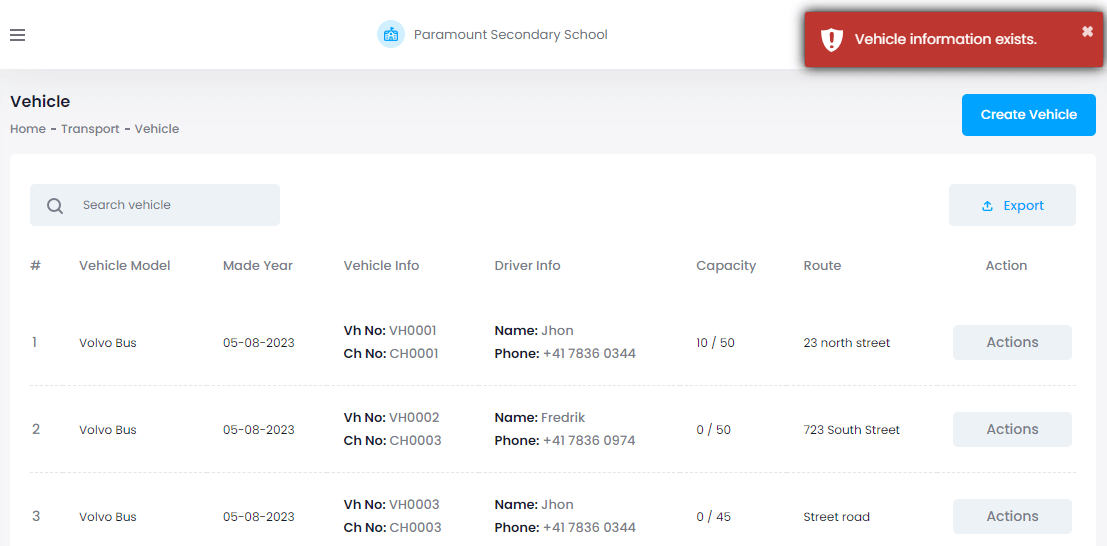 Note: One driver can be assigned with more than one vehicle but one vehicle can not be assigned by two drivers. If you try to add another driver in one vehicle it will show a "Vehicle information exists" notification.